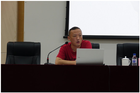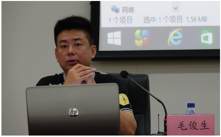 棒、垒、藤、毽球教研室主任,毛俊生副教授。在做毽球运动队的管理和科研的报告。