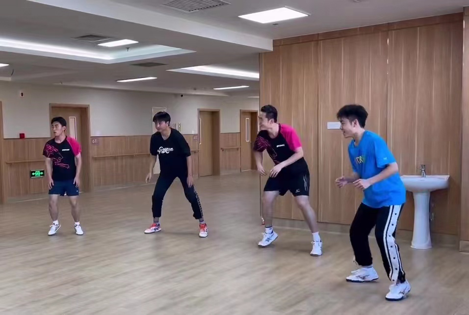 运动员为保持竞技状态,在有限的空间内依旧进行身体训练,为后续的比赛做积极准备。