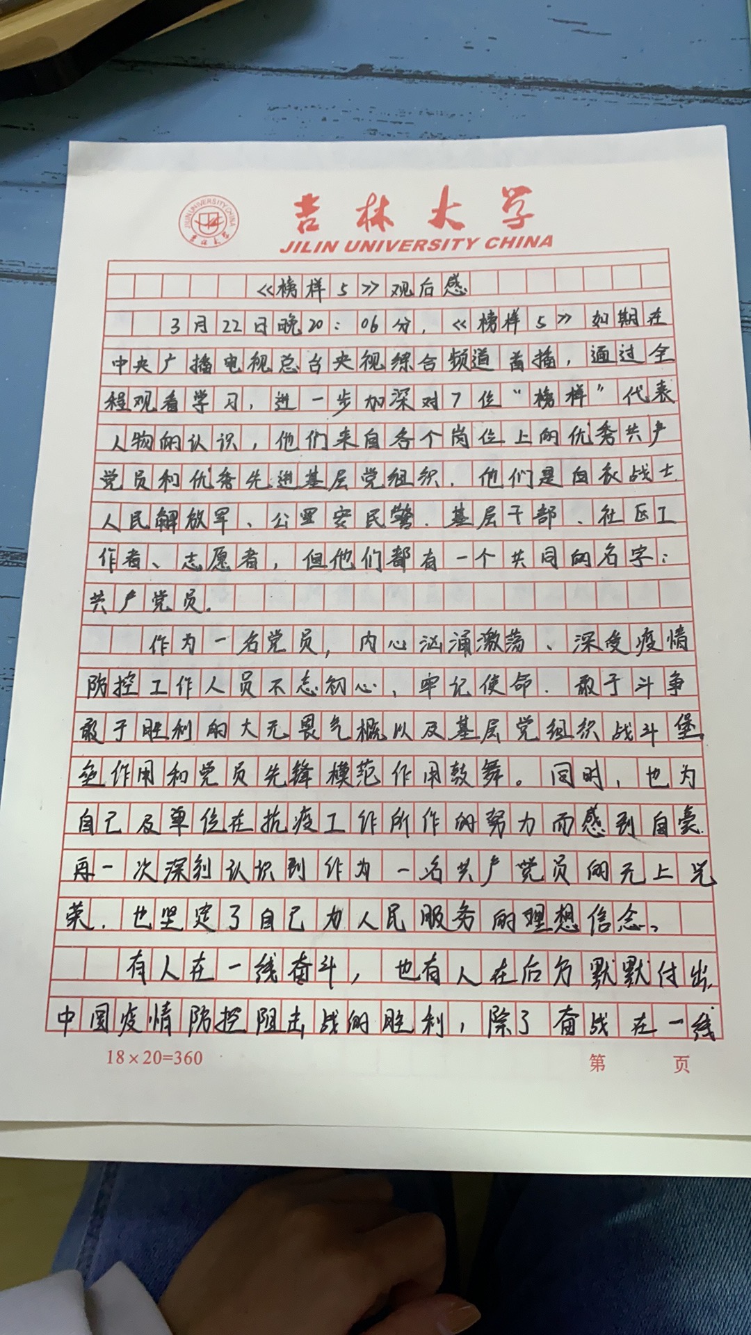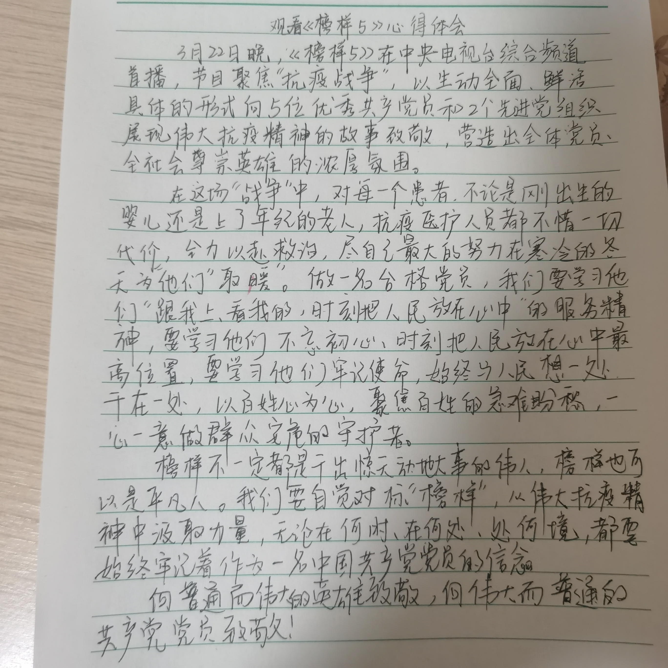 在观看《榜样5》后,学生党员用文字表达了自己的真实感受写出了节目中令自己印象深刻的党员事迹和精神,纷纷表示要向榜样看齐,从榜样的身上汲取更强大的力量,时刻鞭策自己,不忘初心、牢记使命,勇于担当、甘于奉献,无不为榜样的力量为之动容。