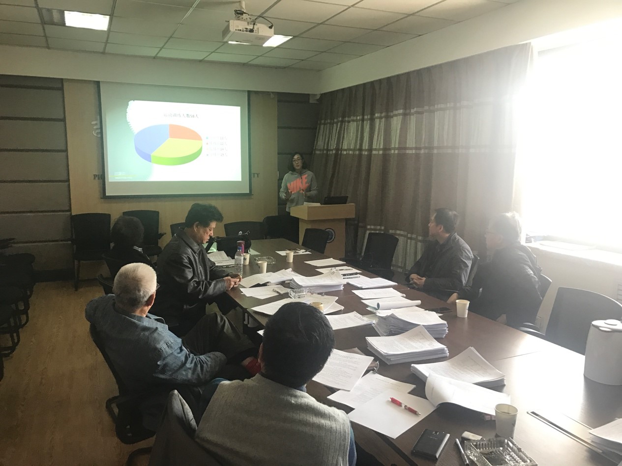 杨杰副院长首先对本科生毕业论文第一阶段的进展情况作了整体的汇报;刘英伟老师代表社会体育指导与管理专业的指导教师就本科生选题方向、选题种类、完成情况等进行汇报;裴晶晶老师代表运动训练专业的指导教师就2013级运动训练专业学生的论文审题、论文类型、论文来源等方面进行了汇报。
