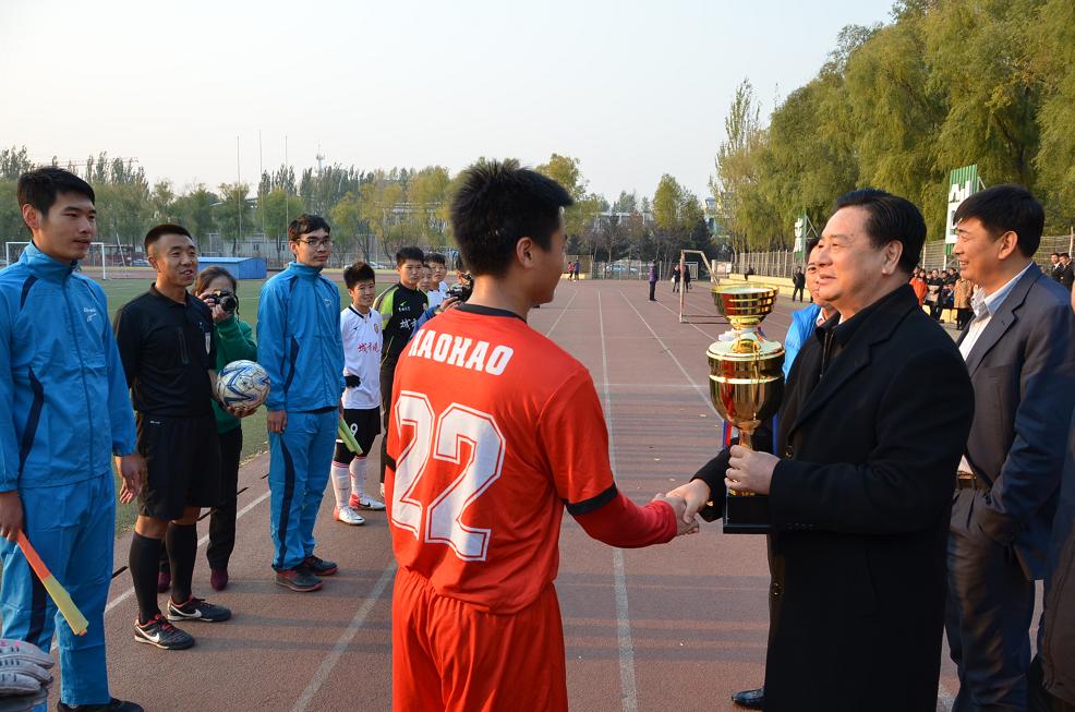 校男子足球队颁发奖杯,与双方队员一一握手交流。李元元校长表示:“成人导航
